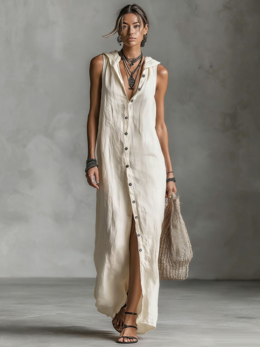 Women's casual loose sleeveless single-breasted cotton linen hooded dress