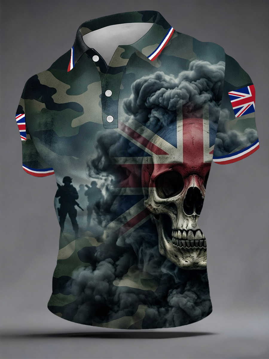 Men's British Veteran Silhouette Skull Camouflage Print Casual Polo