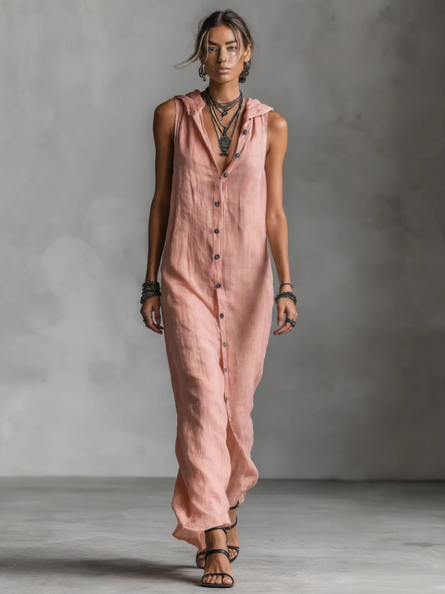 Women's casual loose sleeveless single-breasted cotton linen hooded dress